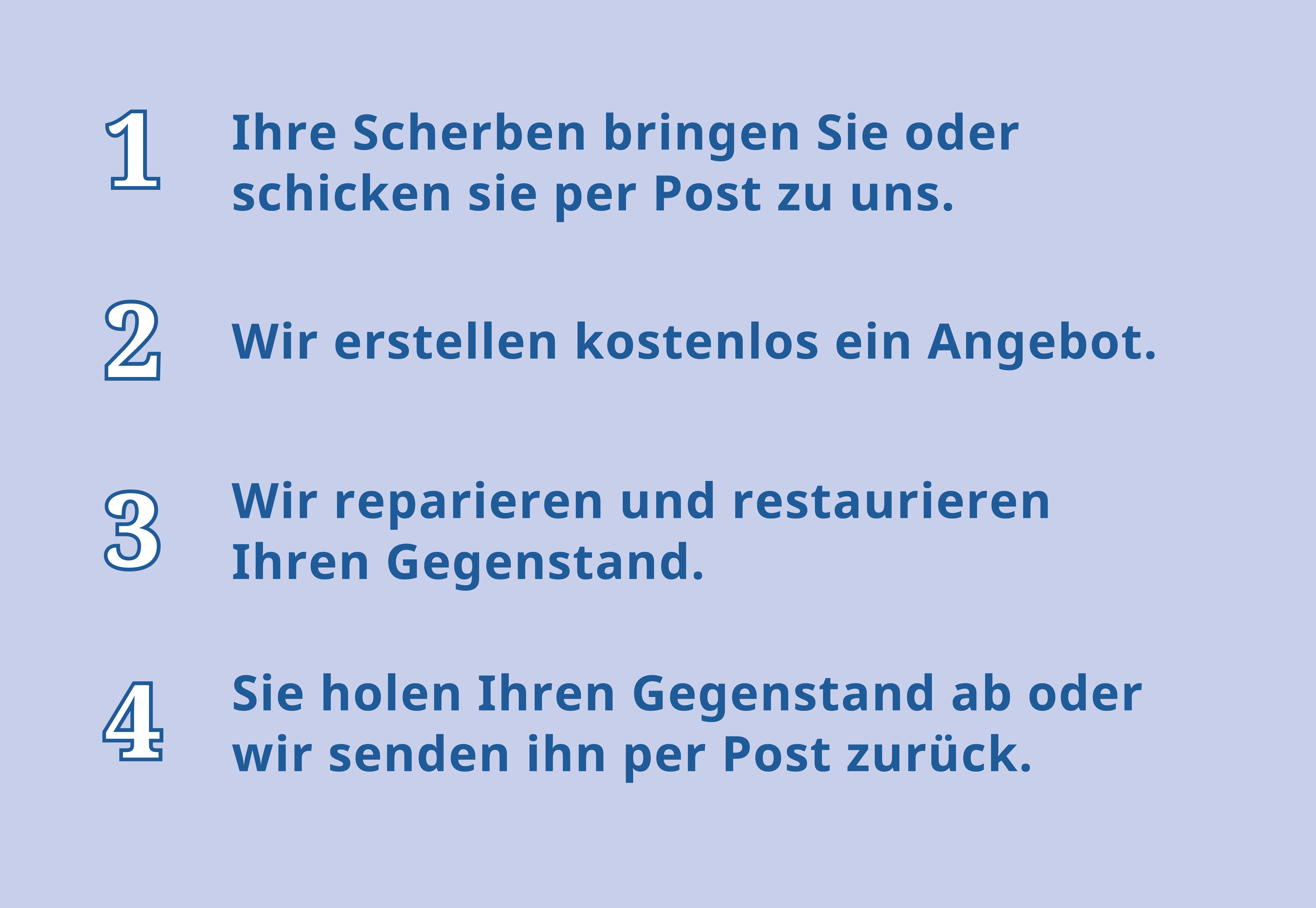 Sobald wir Ihre Scherben in den Händen halten, beraten wir Sie zu Restaurierungsmöglichkeiten und erstellen eine kostenfreie Preiskalkulation. Dann entscheiden Sie, ob die Restaurierung durchgeführt werden soll. Kommen Sie einfach Mittwochs zwischen 9 – 13 Uhr ohne Termin oder nach Vereinbarung zu uns.